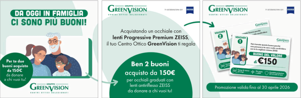 Da GreenVision ci prendiamo cura di te e dei tuoi cari. Acquista un occhiale con lenti Progressive Premium ZEISS e ricevi subito 2 buoni da 150€ da regalare a chi vuoi